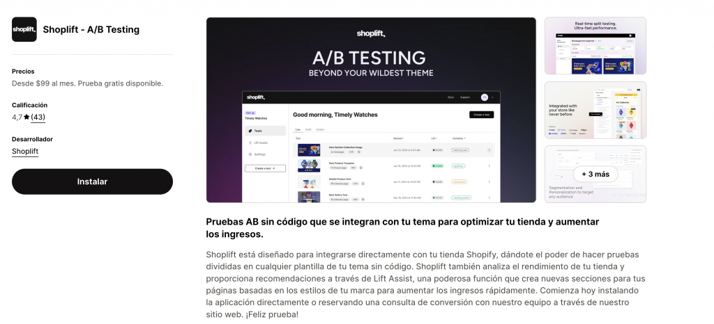 Esta aplicación está diseñada para realizar pruebas A/B en tu ecommerce de Shopify. Se integra directamente. Esta aplicación utiliza Lift Assist, con la que analiza el rendimiento de tu tienda para crear nuevas secciones en tus páginas para mejorar la tasa de conversión. Esta aplicación es de pago pero dispone de una prueba gratis para que puedas probarla y ver todo su potencial