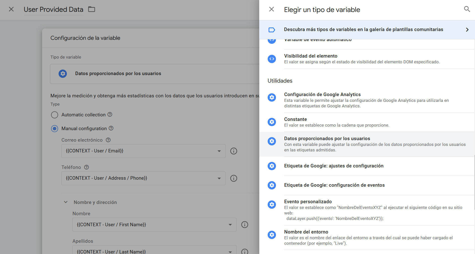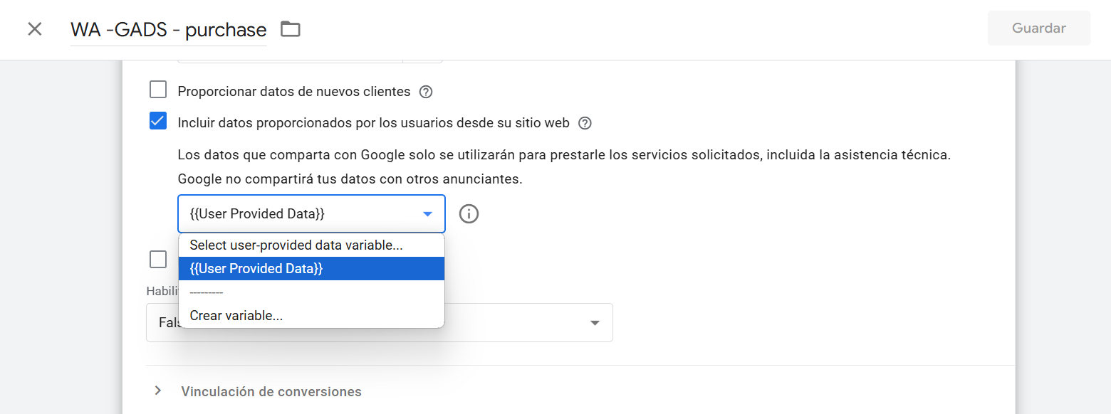 3. En GTM, dentro de la etiqueta de conversión normal que ya debes tener creada, agrega una variable de datos proporcionados por el usuario para capturar el correo electrónico o teléfono o los datos que tengas disponibles adicionalmente a estos dos mencionados.