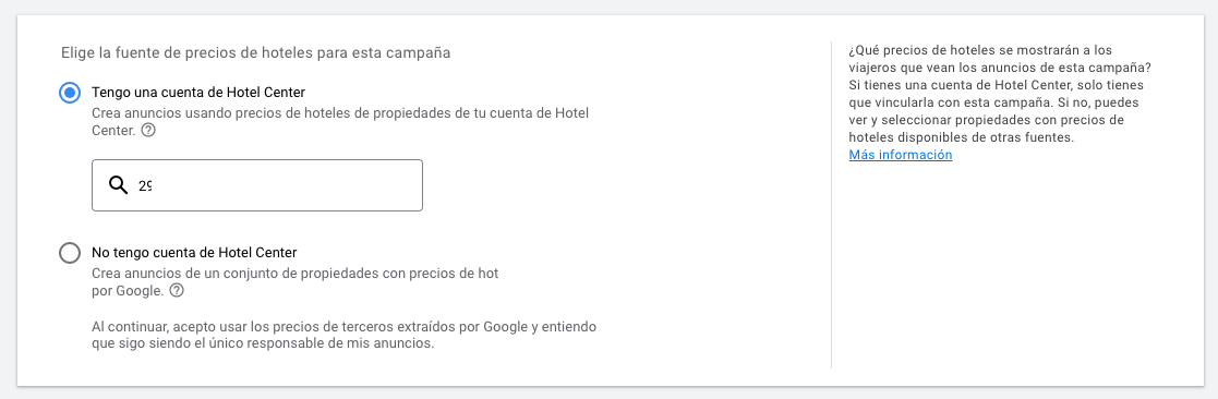 Para realizar este paso, previamente debemos de tener una cuenta en Hotel Center vinculada con el motor de reservas del hotel.