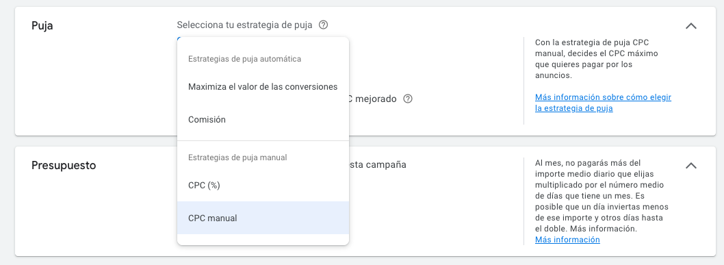 - CPC Manual: Con la estrategia de puja CPC manual, decides el CPC máximo que quieres pagar por los anuncios.