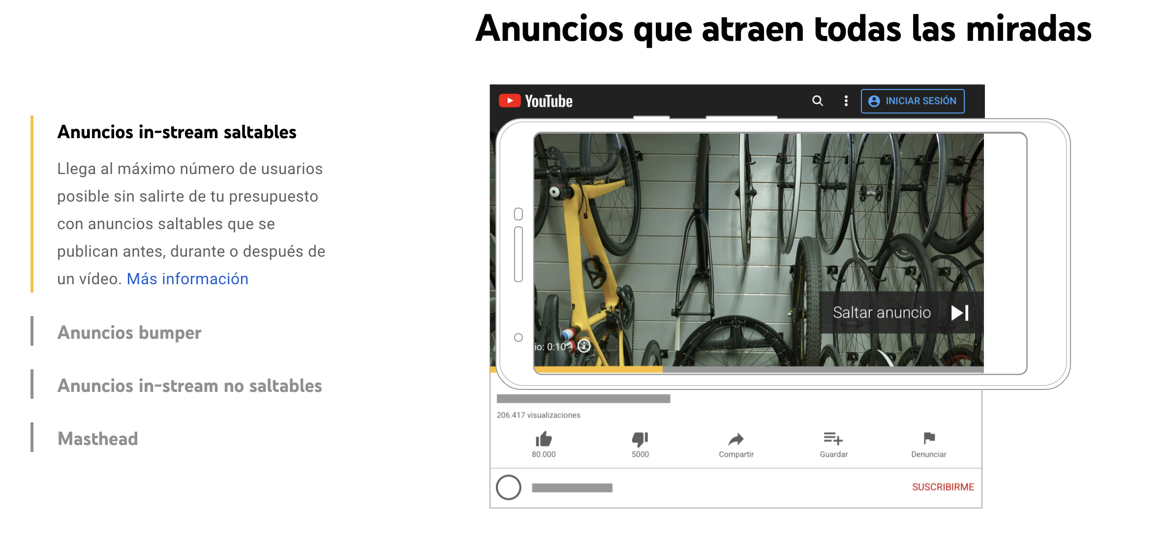 Los anuncios de vídeo saltables permiten a los usuarios elegir si quieren saltar los anuncios pasados 5 segundos. | Ordenadores, dispositivos móviles, televisiones y videoconsolas | Se muestran en el reproductor de vídeo y pueden saltarse al cabo de 5 segundos. |