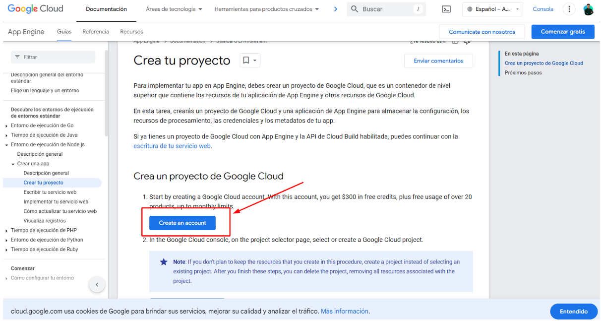 Si aún no tienes una cuenta de Google Cloud habilitada, puedes crearla ahora. Durante el registro, deberás ingresar una tarjeta bancaria, pero no se realizarán cobros si te mantienes dentro de los límites gratuitos de Google.
