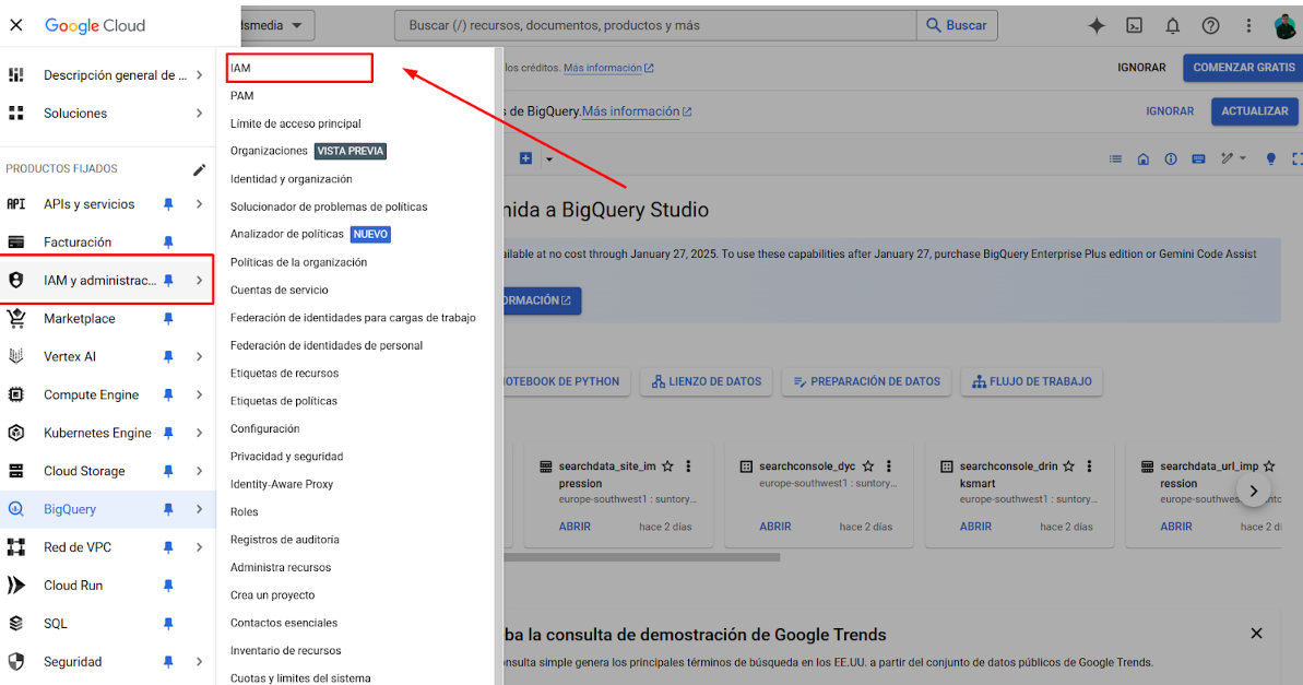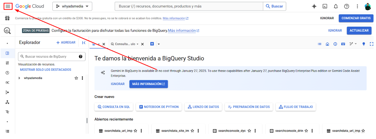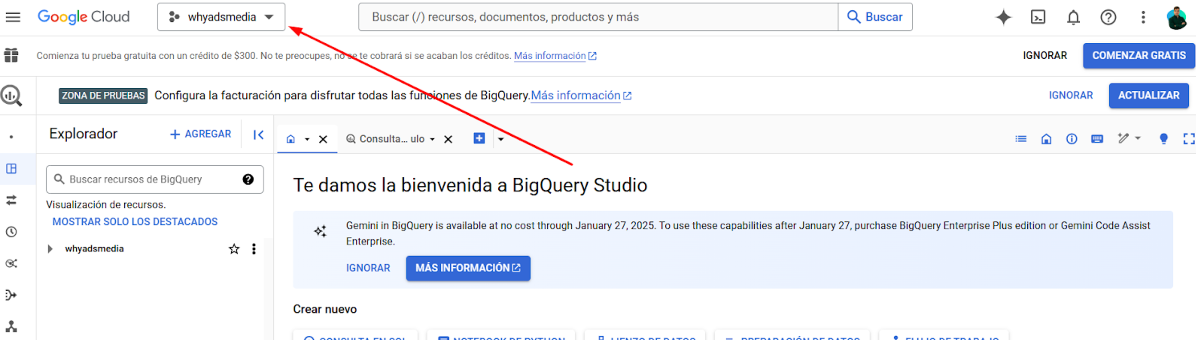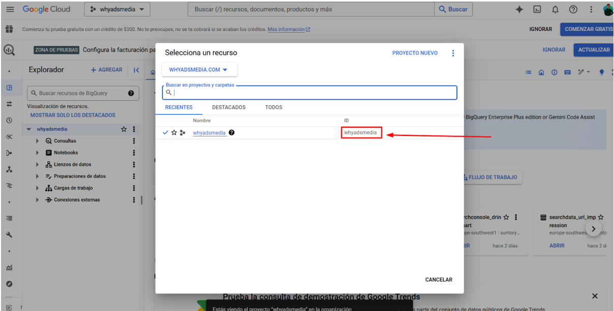 Accede a BigQuery y asegúrate de estar dentro del proyecto donde deseas almacenar los datos de Google Search Console.