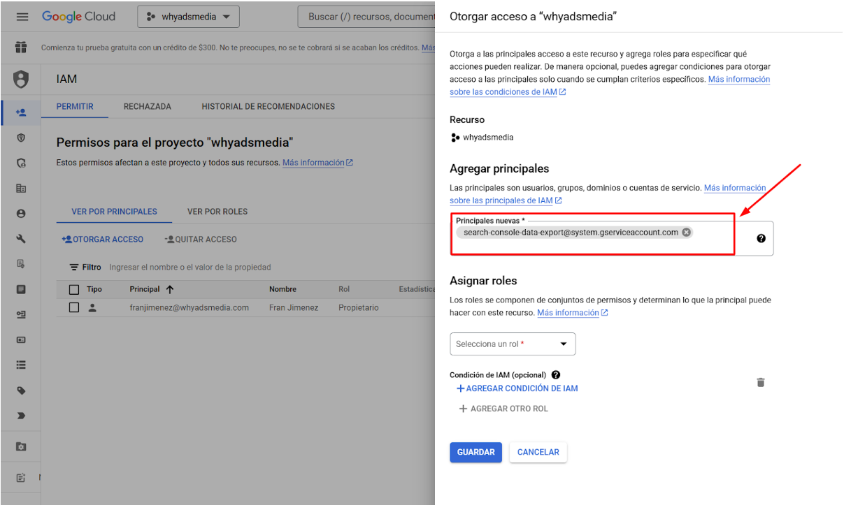 En el campo «Principales nuevas», introduce la siguiente cuenta de servicio: