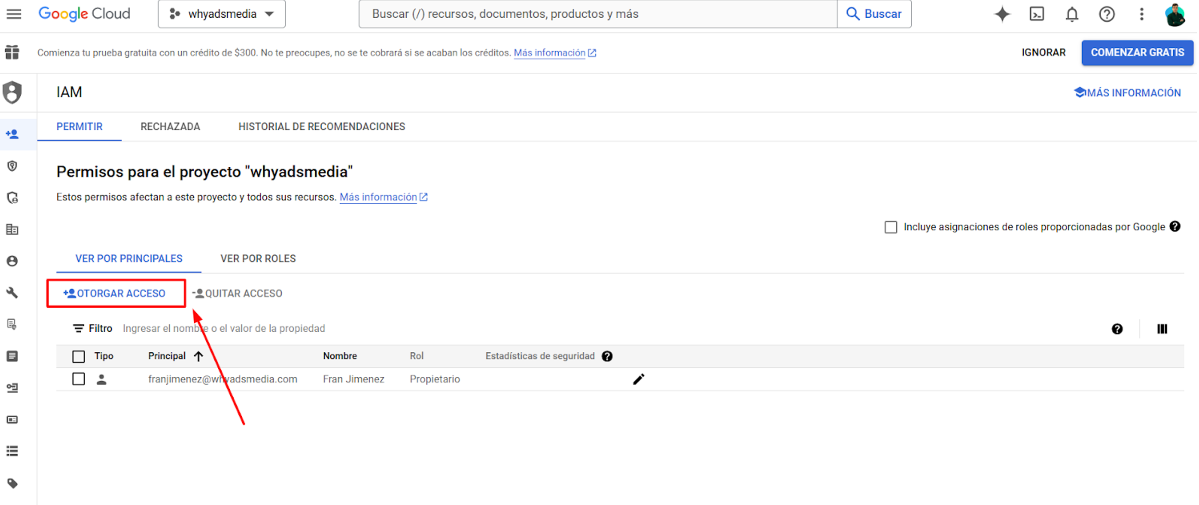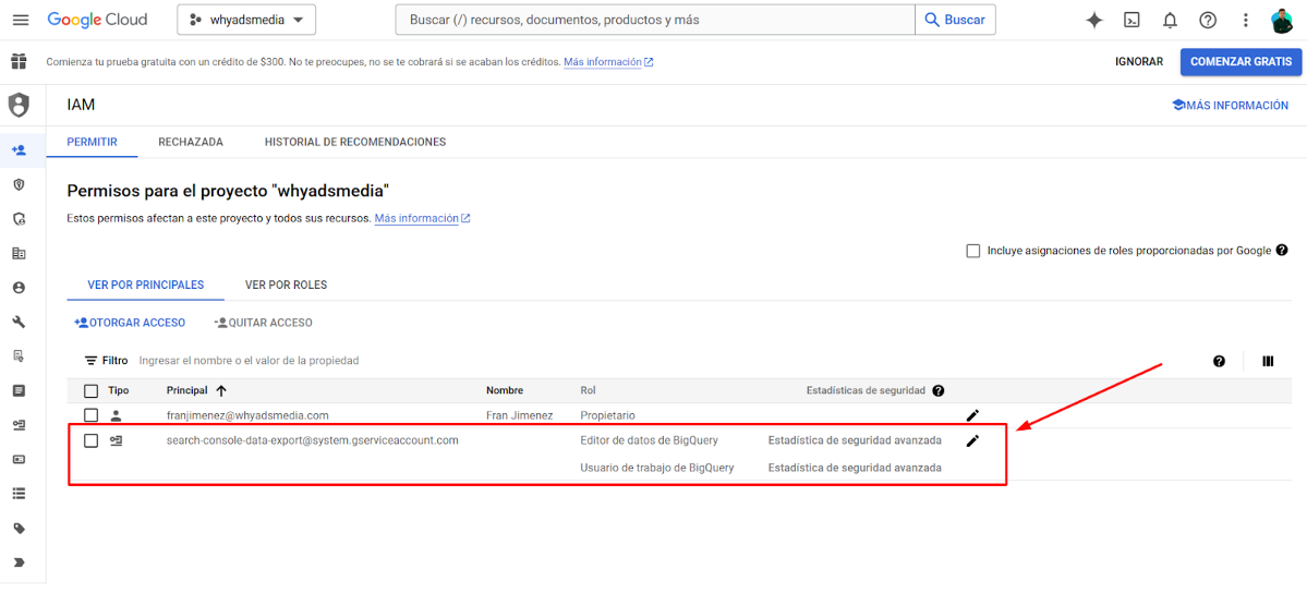 Si lo hiciste correctamente, deberías ver la nueva cuenta de servicio en tu lista de IAM.